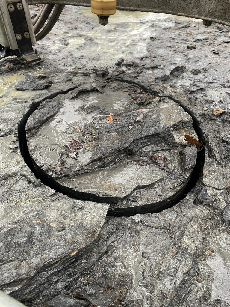 Spor etter slisseboring i fjell. En teknologi utviklet av Comrod på Tau for montering av komposittmaster.